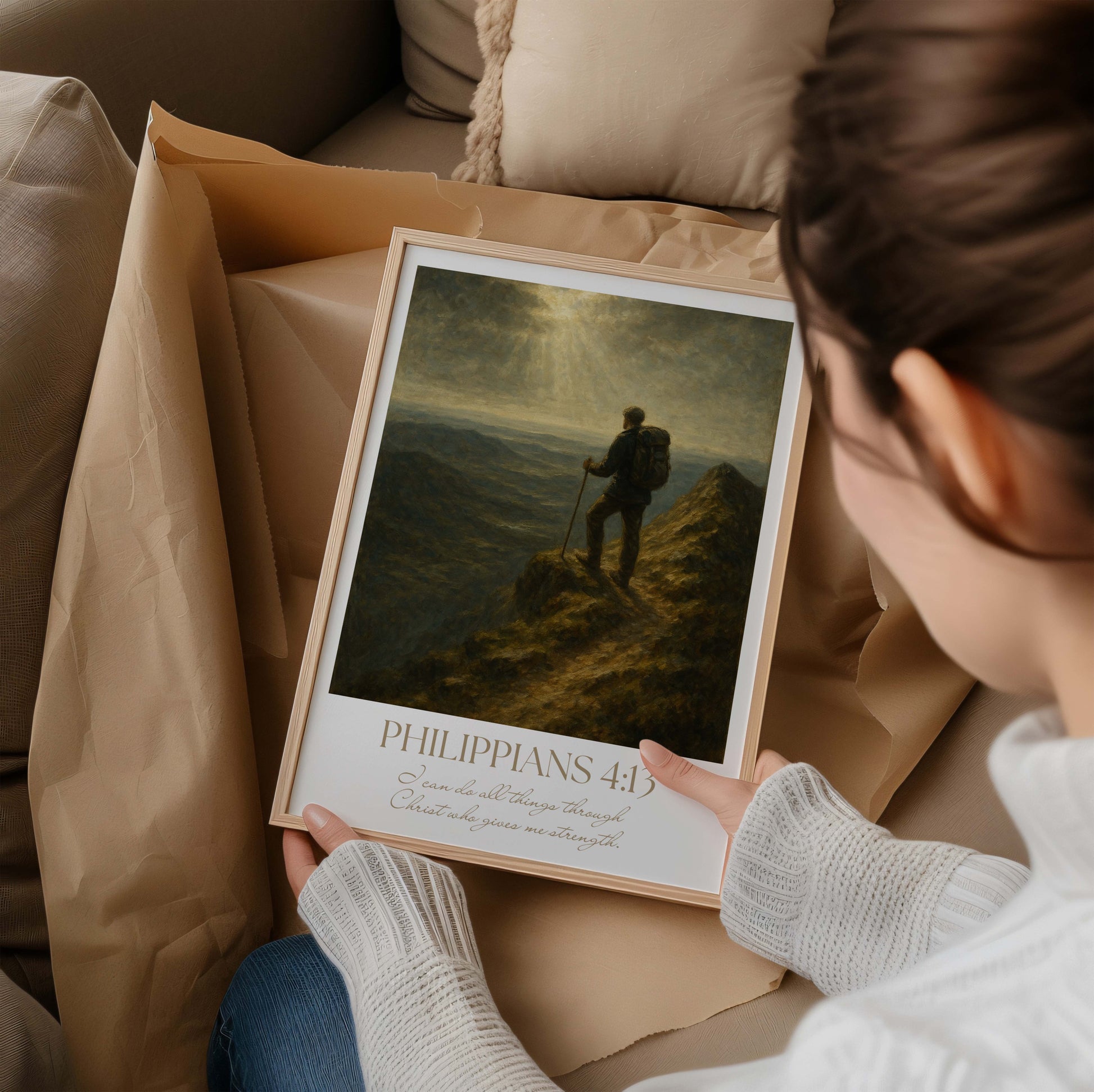 This Philippians 4:13 artwork pairs a striking mountain summit with the truth that Christ gives you the strength to face anything. A meaningful addition to your Christian home decor.